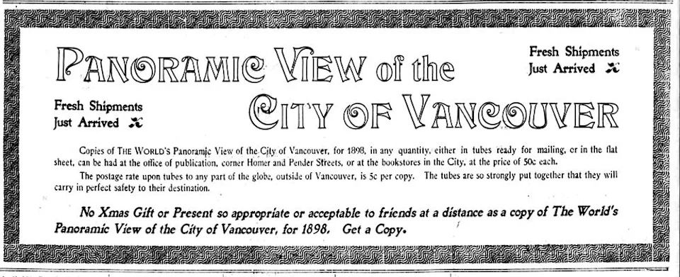 Ad for the Vancouver World’s “Panoramic View of the City of Vancouver” map in the Dec. 27, 1898 Vancouver World.