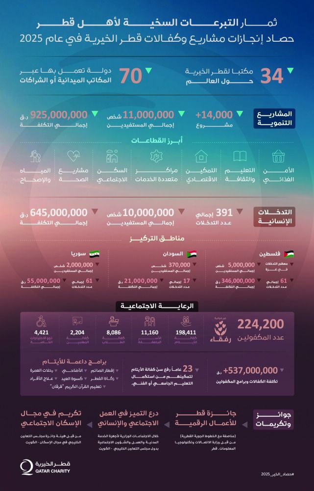 نفذت قطر الخيرية خلال عام 2025 أكثر من 14,000 مشروع تنموي بتكلفة إجمالية تقارب 925 مليون ريال قطري، واستفاد منها أكثر من 11 مليون شخص.