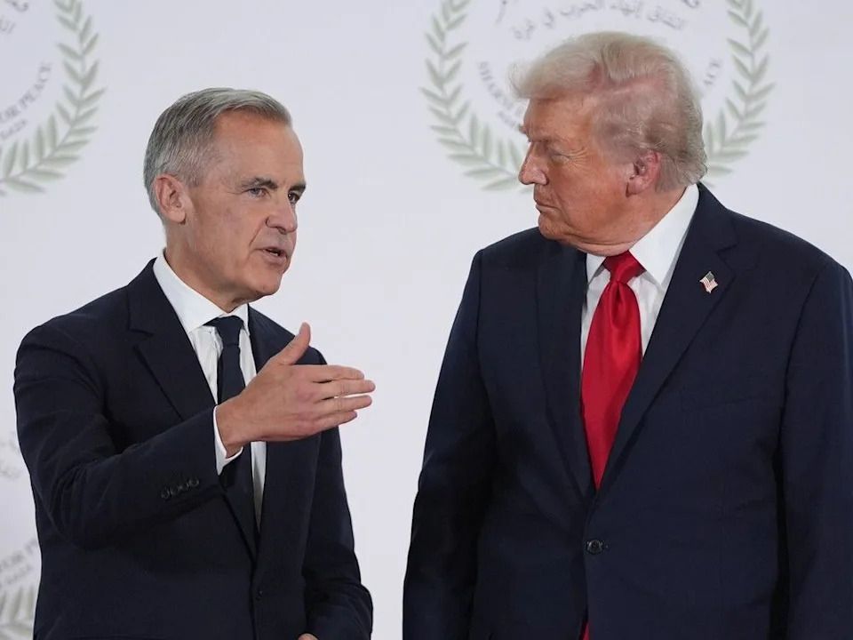 Prime Minister Mark Carney speaks with U.S. President Donald Trump in Sharm El Sheikh, Egypt, on Oct. 13, 2025.