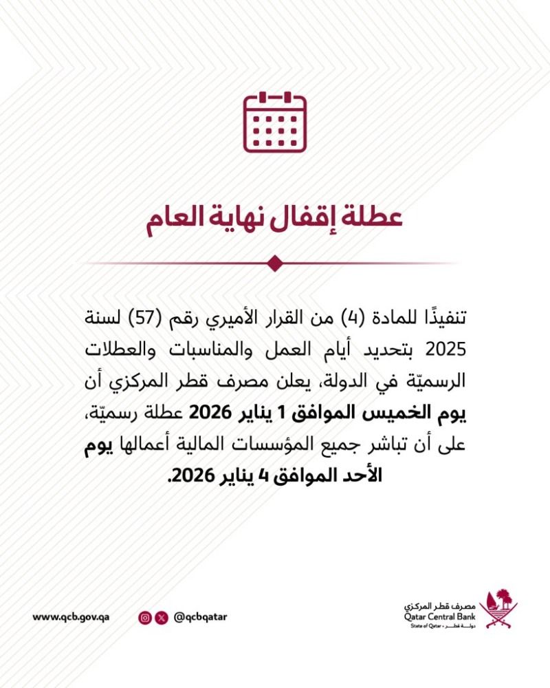 تنفيذاً للمادة 4 من القرار الأميري رقم 57 لسنة 2025 بتحديد أيام العمل والمناسبات والعطلات الرسمية في الدولة، يعلن مصرف قطر المركزي أن يوم الخميس الموافق 1 يناير 2026 عطلة رسمية، على أن تباشر جميع المؤسسات المالية أعمالها يوم الأحد الموافق 4 يناير 2026.
