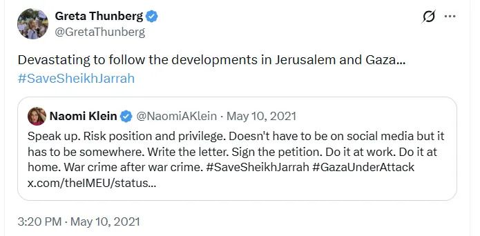 Thunberg, likely trusting the wisdom of an older climate activist she respected, shared Klein’s post writing, “Devastating to follow the developments in Jerusalem and Gaza… #SaveSheikhJarrah.”