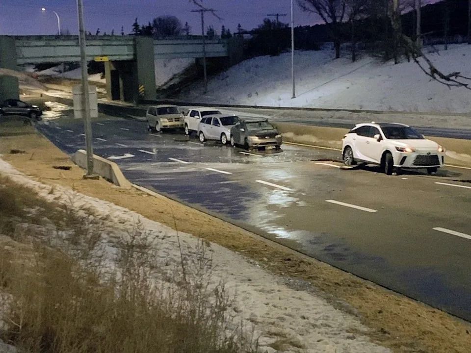 A major water main break flooded a large section of 16th Avenue near Sarcee Trail N.W., stranding about 10 vehicles in the flood water on December 30, 2025.