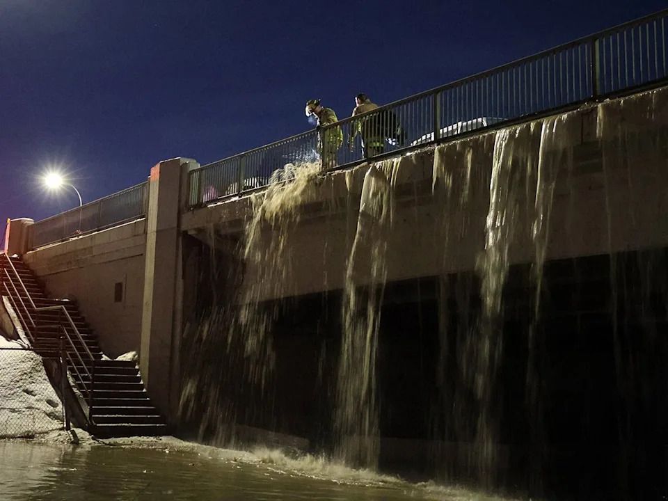 Water pours from a bridge on 16th Avenue near Shouldice Park, several hundred metres from a major water main break on December 30, 2025.