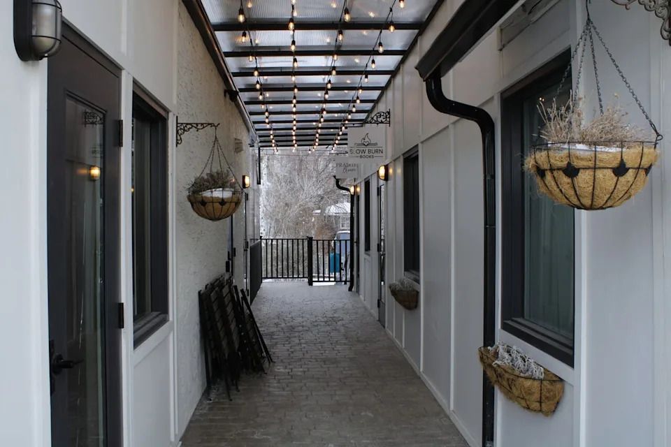 One of the 'snickets' between Leonard Development Group's properties along 34th Avenue. The narrow passageways create more space for micro-businesses to set up shop. (Kelsea Arnett/CBC)