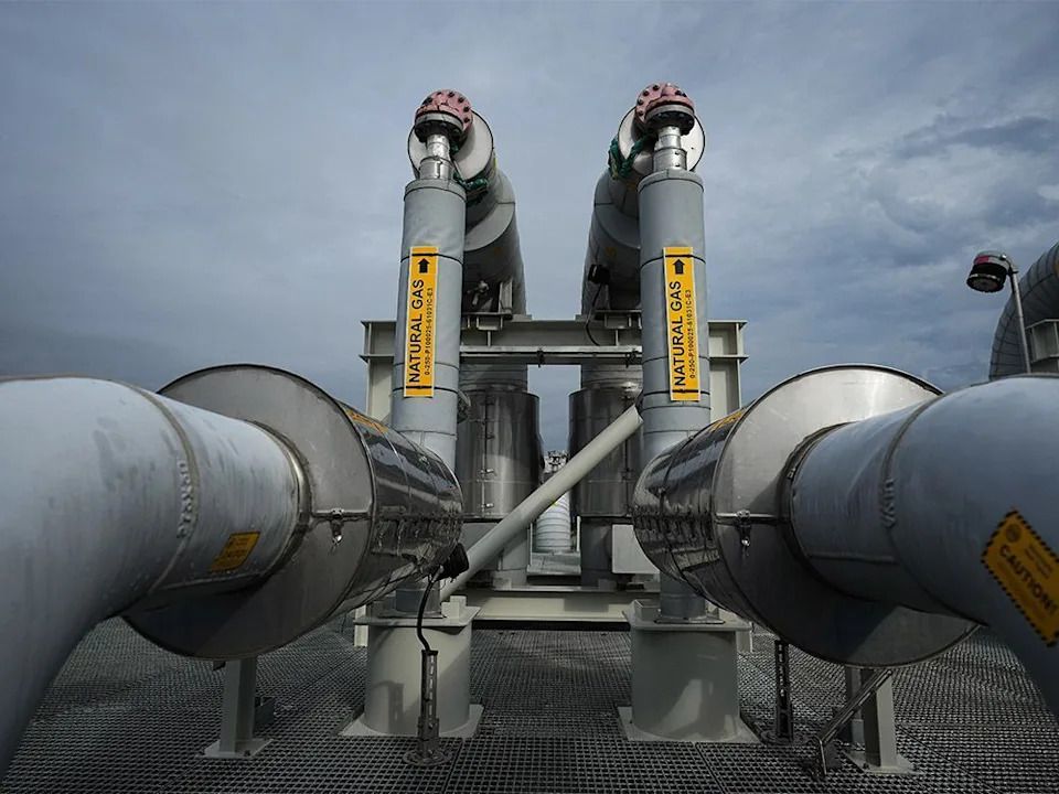 Piping is seen on the top of a receiving platform which will be connected to the Coastal GasLink natural gas pipeline terminus at the LNG Canada export terminal under construction, in Kitimat, B.C., Wednesday, Sept. 28, 2022.