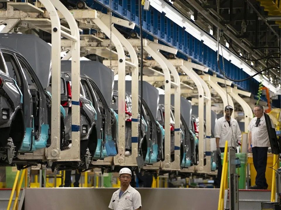 Workers continue vehicle assembly at the Honda of Canada Manufacturing Plant 2 in Alliston, Ontario, on April 25, 2024.