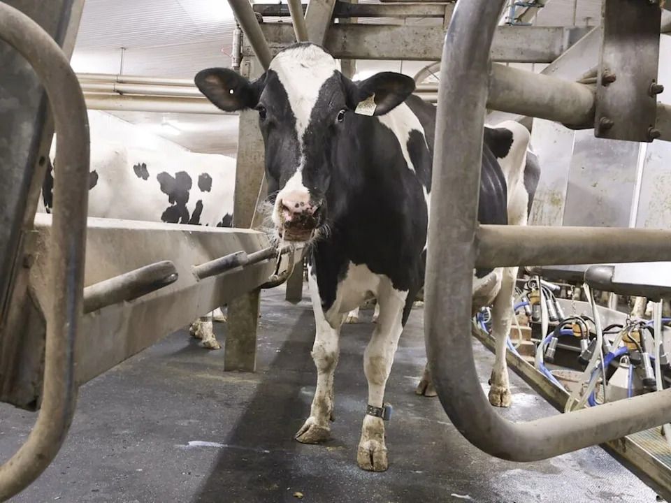 A cow leaves the milking parlour at a dairy farm in Howick, Quebec, Canada, on Tuesday, Jan. 11, 2022.