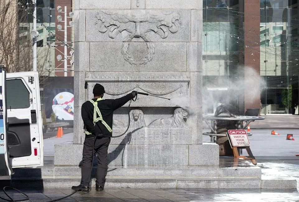 Crews remove graffiti from the cenotaph outside Edmonton City Hall, Tuesday March 12, 2024.