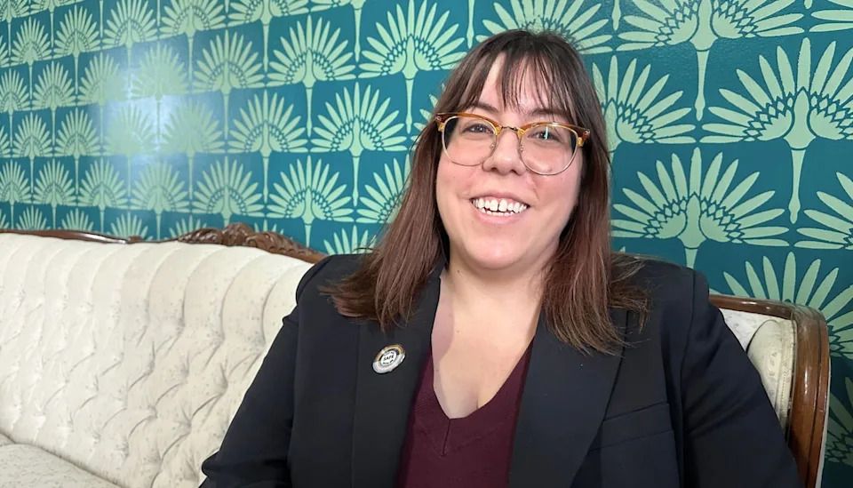 Kassandra Chancey, executive director of the Allied Arts Council of Pincher Creek, sits in the Lebel Mansion's concert space. (Elise Stolte/CBC)