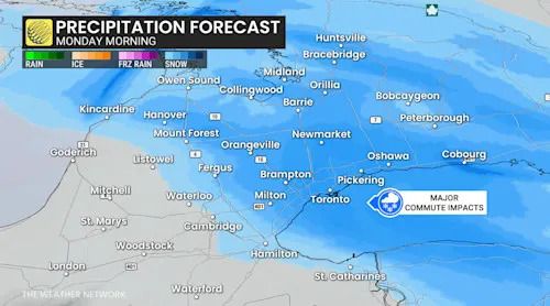 Widespread snow is expected for Monday with the next system, bringing 3-15 cm to a good portion of southern Ontario. The poorly timed snow will impact the Monday morning commute. Brace for slower commute times as road conditions will deteriorate quickly.