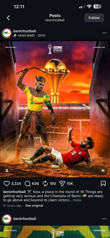 وأرفقتها بصورة انتشرت بسرعة البرق، ظهرت فيها شخصية قائد منتخب مصر محمد صلاح، ملقى على الأرض وكأنه محطم، بينما يقف أمامه لاعب بنيني يرتدي زيّا تاريخيا ويحمل في يده كرباجا (سوطا) في إشارة تهكمية استفزازية قبل المواجهة المرتقبة.