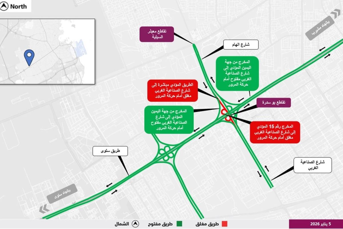 أعلنت هيئة الأشغال العامة "أشغال" عن إغلاق مؤقت وكامل عند مخرج تقاطع بو سدرة أمام القادمين من طريق سلوى ومن تقاطع معيذر – السيلية باتجاه شارع الصناعية الغربي، وذلك اعتبارًا من الساعة الثانية فجر يوم الجمعة 9 يناير 2026 وحتى الساعة السابعة صباحًا من يوم السبت 17 يناير 2026، لإجراء أعمال صيانة.