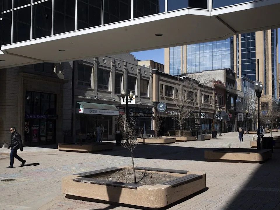 Pedestrians walk through downtown at Scarth Street Mall on April 7, 2025 in Regina.