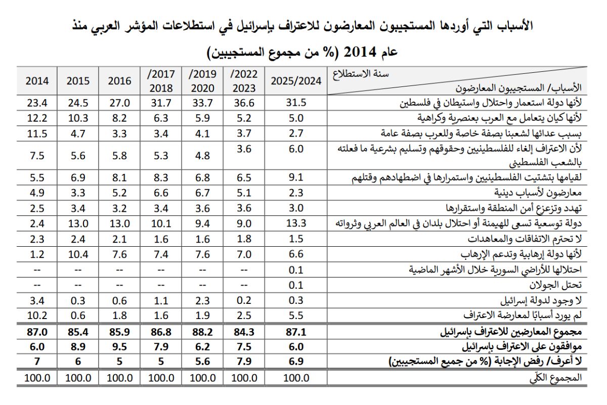 وعزا المستجيبون الرافضون للاعتراف بإسرائيل موقفهم إلى أسباب تتعلق بطبيعتها الاستعمارية والعنصرية والتوسعية، واستمرار احتلالها الأراضي الفلسطينية، في حين غابت التفسيرات الثقافية أو الدينية، وهي الأسباب ذاتها التي أوردها الرأي العام في الاستطلاعات السابقة.