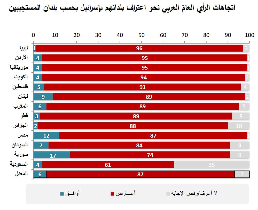 وبيّنت النتائج أن أعلى نسب رفض الاعتراف بإسرائيل كانت في ليبيا (96%) والأردن (95%)، تليهما الكويت (94%)، ثم فلسطين (91%)، ولبنان، والمغرب، وقطر (89% لكل منها). كما أظهرت أن مستجيبي إقليمي الخليج والمغرب العربي كانوا الأكثر رفضًا للاعتراف بإسرائيل.