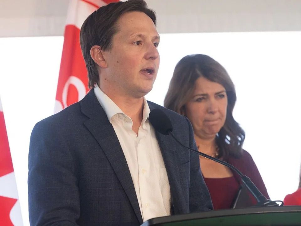 Devin Dreeshen, Minister of Transportation and Economic Corridors, answers questions from media alongside Premier Danielle Smith in June 2025.
