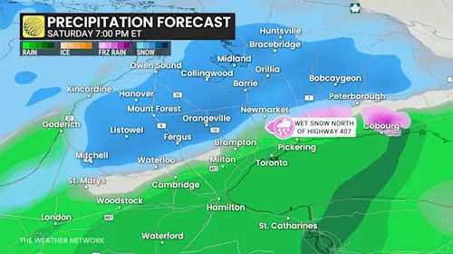 Wet snow is expected north of Highway 407 and regions to the north and east of the major highway stretch. A sharp gradient will develop across Toronto, with rain to the south and snow to the north.