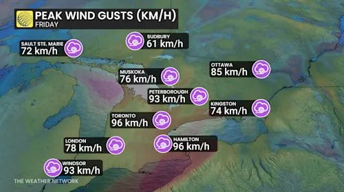 Peak Ontario wind gusts Friday