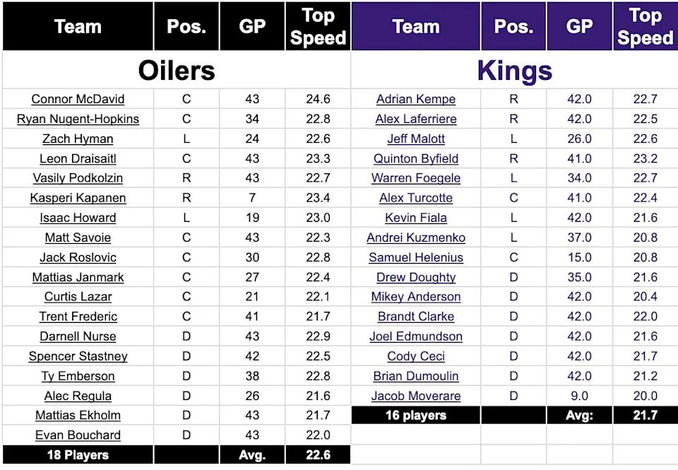 4. The Oilers are a much faster team than the Kings, at least if you go my the maximum speeds of each player this year recorded by NHL Edge and reported at the Puckalytics site.