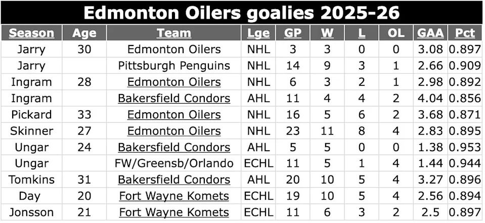 1. When Jarry returns the Oilers could go with three goalies in Edmonton, but does that make sense? They all have to play in order to keep sharp and for Edmonton to continue to evaluate them before the 2026 trade deadline.