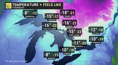 Temperatures across northern Ontario are set to drop by 10-15°C from Tuesday into Wednesday. By Wednesday night into Thursday, the cold air will move into southern Ontario, bringing daytime highs in the minus double digits, with wind chills making it feel closer to the -20s.