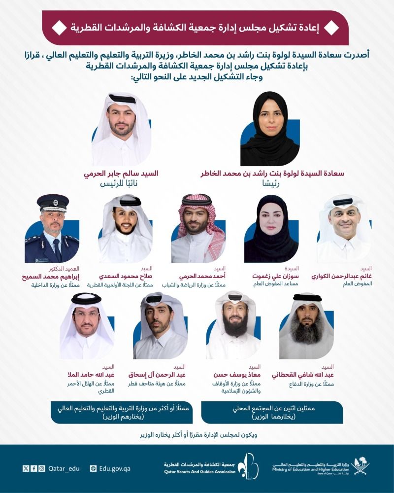 أصدرت سعادة السيدة لولوة بنت راشد بن محمد الخاطر، وزيرة التربية والتعليم والتعليم العالي ورئيسة مجلس إدارة جمعية الكشافة والمرشدات القطرية، قرارًا بإعادة تشكيل مجلس إدارة الجمعية، في إطار تنظيم عملها وتعزيز دورها في تنمية الحركة الكشفية والإرشادية.