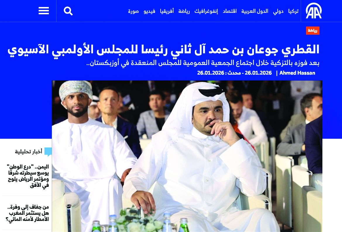 واهتم موقع سي إن إن عربية بحدث انتخاب الشيخ جوعان رئيسا للمجلس الأولمبي الآسيوي، وعدد الموقع خصال سعادته في إدارة الشأن الرياضي مشيرا إلى أن انتخابه جرى خلال أعمال اجتماع الجمعية العمومية الـ46 الذي عقد في العاصمة الأوزبكية طشقند، بمشاركة أكثر من 350 مسؤولا عن الرياضة في 45 لجنة أولمبية آسيوية.