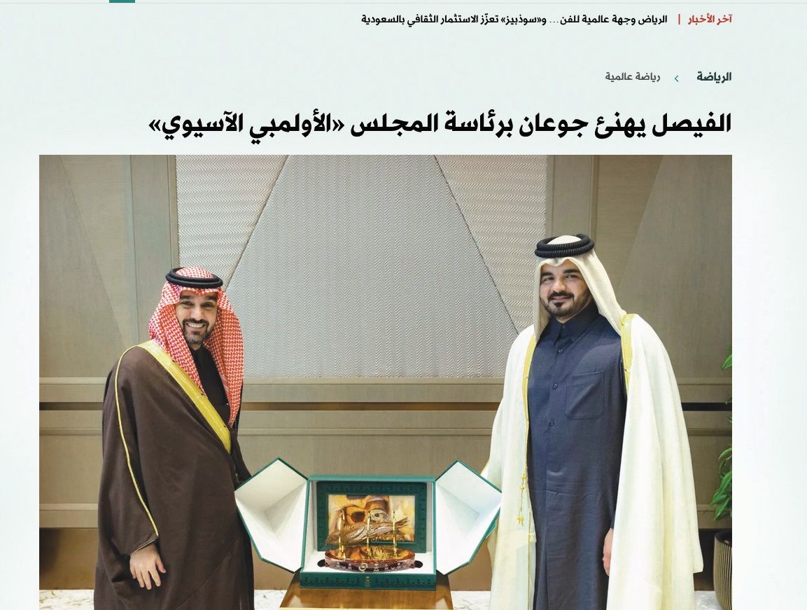 وتحت عنوان «الفيصل يهنئ جوعان برئاسة المجلس الأولمبي الآسيوي» كتبت الجريدة أن الفيصل أكد تزكية الشيخ جوعان تعكس الثقة الكبيرة التي يحظى بها على مستوى القارة الآسيوية، مشيراً إلى أهمية مواصلة العمل المشترك بين اللجان الأولمبية الوطنية، وتعزيز التعاون والتكامل بما يسهم في تطوير الرياضة الآسيوية، وتحقيق تطلعات الرياضيين، وترسيخ القيم الأولمبية، متمنياً له التوفيق والسداد في قيادة الرياضة الآسيوية خلال المرحلة المقبلة.