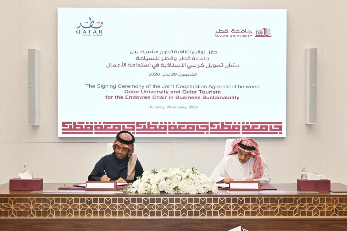 وقّعت جامعة قطر، اليوم، اتفاقية تعاون مشترك مع قطر للسياحة تهدف إلى تعزيز التعاون في مجالات البحث والتعليم والاستشارات والتدريب، وتمويل كرسي الأستاذية في استدامة الأعمال بما يسهم في دعم التنمية المستدامة وبناء القدرات الوطنية.