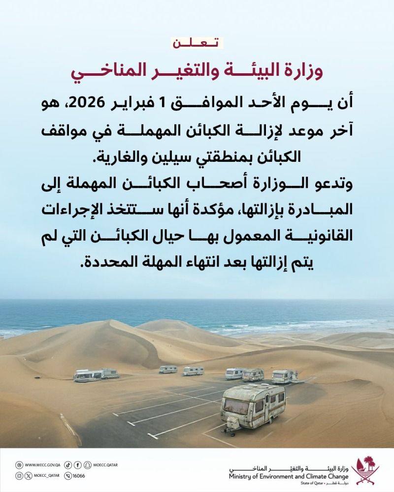 أعلنت وزارة البيئة والتغير المناخي أن يوم غدٍ الأحد الموافق 1 فبراير 2026، هو آخر موعد لإزالة الكبائن المهملة في مواقف الكبائن بمنطقتي سيلين والغارية.