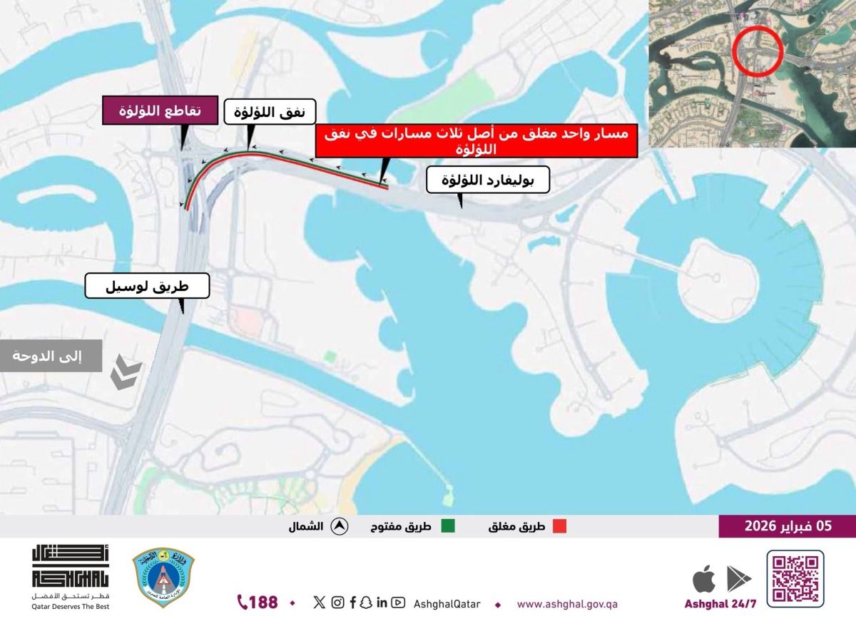 أعلنت هيئة الأشغال العامة "أشغال" عن إغلاق المسار الأيسر في نفق تقاطع اللؤلؤة على طريق لوسيل، باتجاه الدوحة، وذلك اعتبارًا من الساعة الثانية صباحًا يوم السبت الموافق 7 فبراير 2026 وحتى الساعة الثانية صباحًا من يوم الأحد الموافق 8 فبراير 2026، لإجراء أعمال صيانة ضرورية، وذلك بالتنسيق مع الإدارة العامة للمرور.