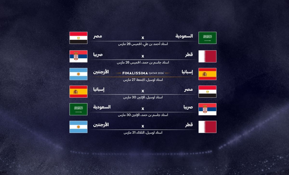 وتشمل مباريات مهرجان قطر لكرة القدم: كأس فيناليسيما 2026 بين إسبانيا والأرجنتين على استاد لوسيل 27 مارس.