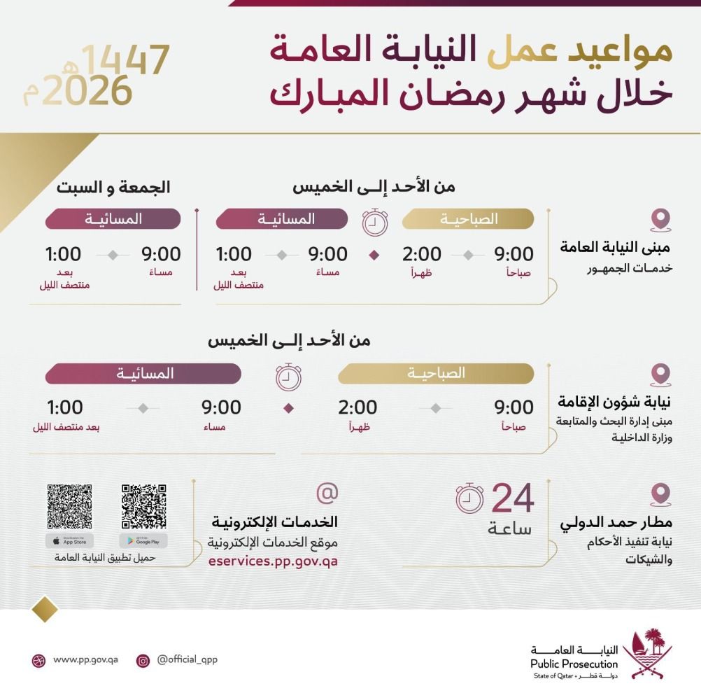 أعلنت النيابة العامة عن مواعيد عملها خلال شهر رمضان المبارك 1447 هـ - 2026 مـ.
