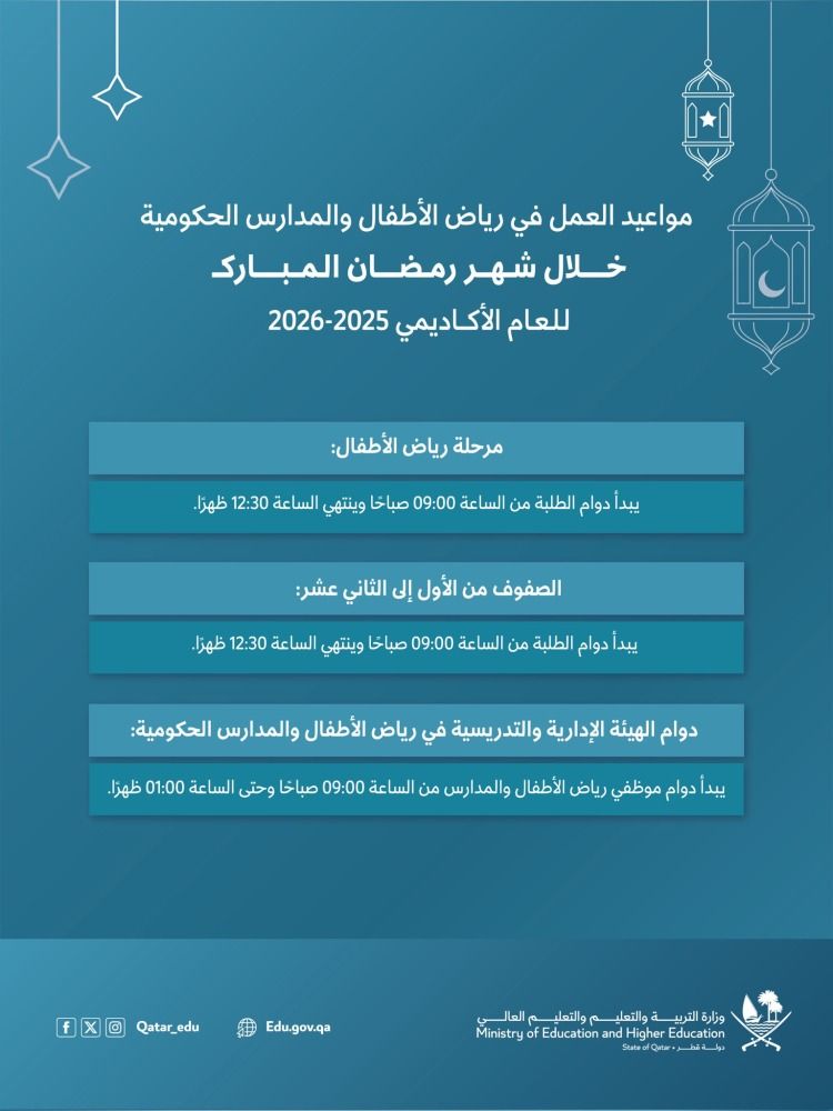 أعلنت وزارة التربية والتعليم والتعليم العالي، اليوم الثلاثاء، عن مواعيد العمل في رياض الأطفال والمدارس الحكومية خلال شهر رمضان المبارك 1447 هـ - 2026 مـ.