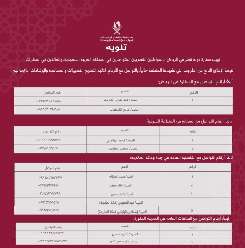 وأهابت السفارة دولة قطر بالمواطنين القطريين المتواجدين في المملكة العربية السعودية، والعالقين في المطارات نتيجة الإغلاق الناتج عن الظروف التي تشهدها المنطقة حالياً، بالتواصل مع الأرقام التالية لتقديم التسهيلات والمساعدة والإرشادات اللازمة لهم: