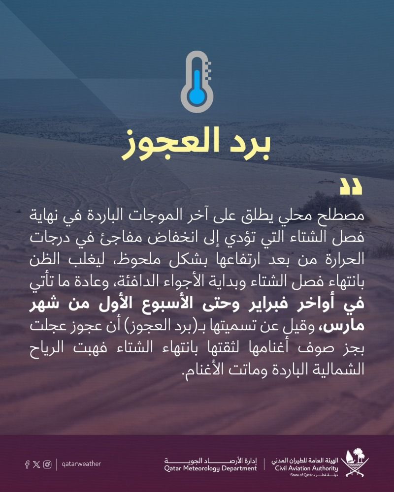 نوهت "أرصاد قطر" عبر حسابها بمنصة "إكس"، إلى أن "برد العجوز" هو آخر الموجات الباردة في فصل الشتاء.