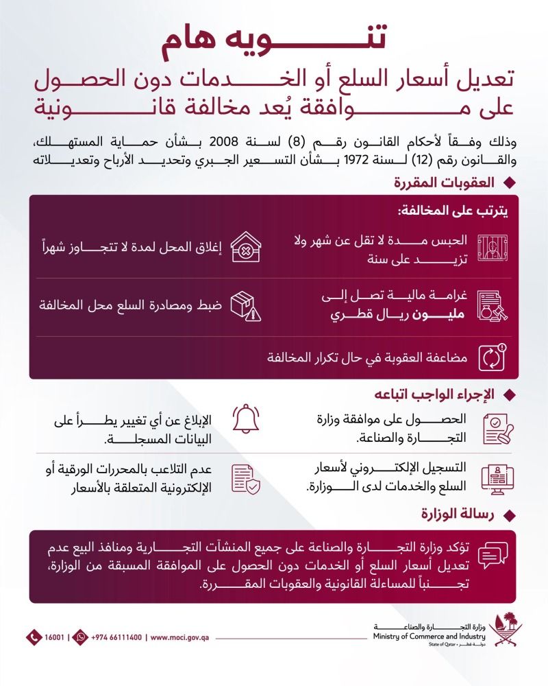 أكدت وزارة التجارة والصناعة على عدم تعديل أسعار السلع أو الخدمات دون الحصول على موافقة مسبقة من الوزارة، مشددة على أن مخالفة ذلك سيكون عُرضة للمساءلة القانونية والعقوبات المقررة.