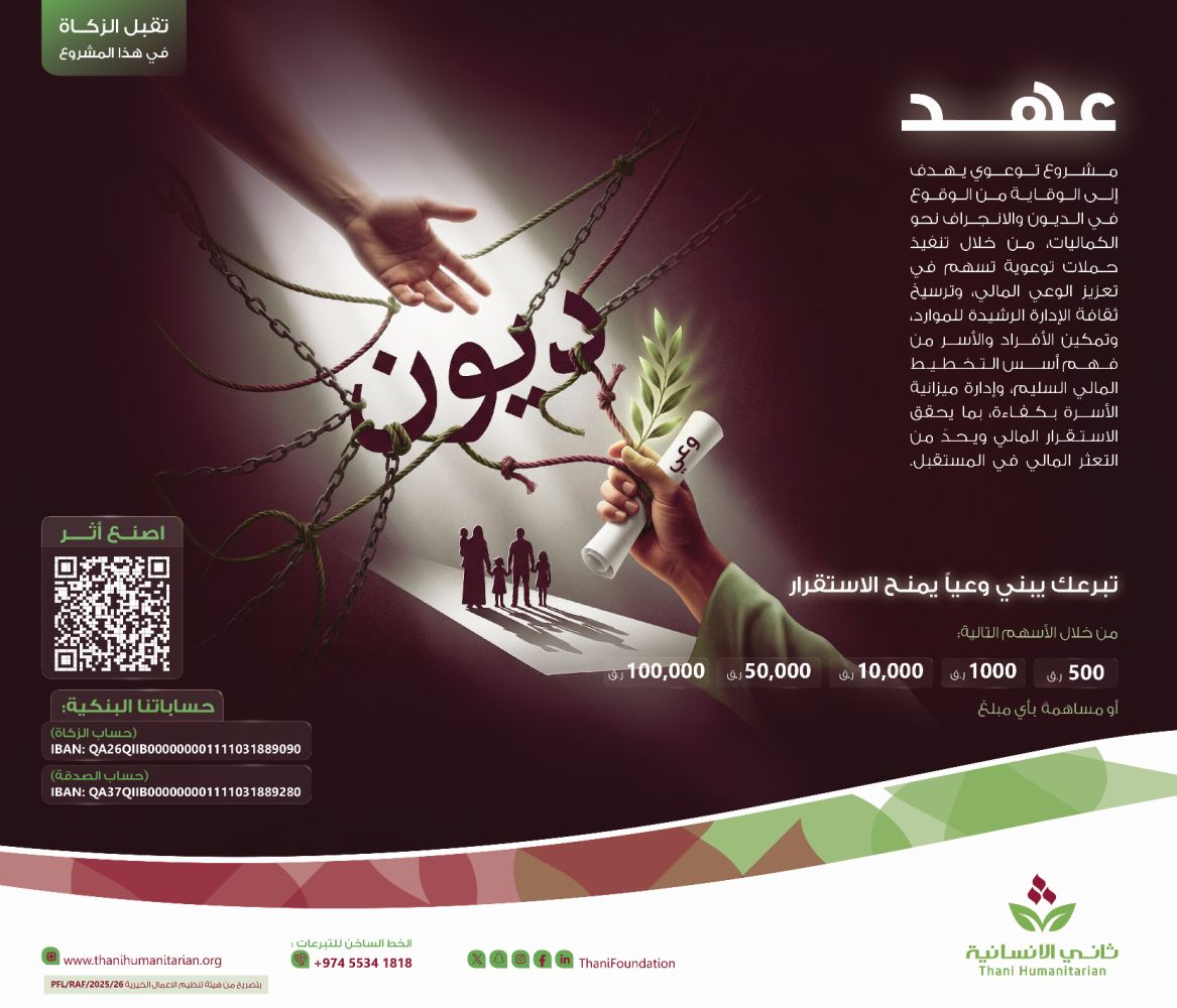 واختتم مدير مشروع «عَهْد» حديثه بالتأكيد على أن التكافل الحقيقي لا يقتصر على سداد دين، بل يتمثل في تمكين الإنسان ومنحه فرصة للحياة من جديد، داعيًا أفراد المجتمع ومؤسساته إلى دعم مشروع «عَهْد» والمشاريع النوعية الأخرى لمؤسسة ثاني بن عبد الله الإنسانية، عبر قنوات التبرع المختلفة، بما يسهم في تعزيز الاستقرار الاجتماعي وتحقيق أثر إنساني وتنموي مستدام.