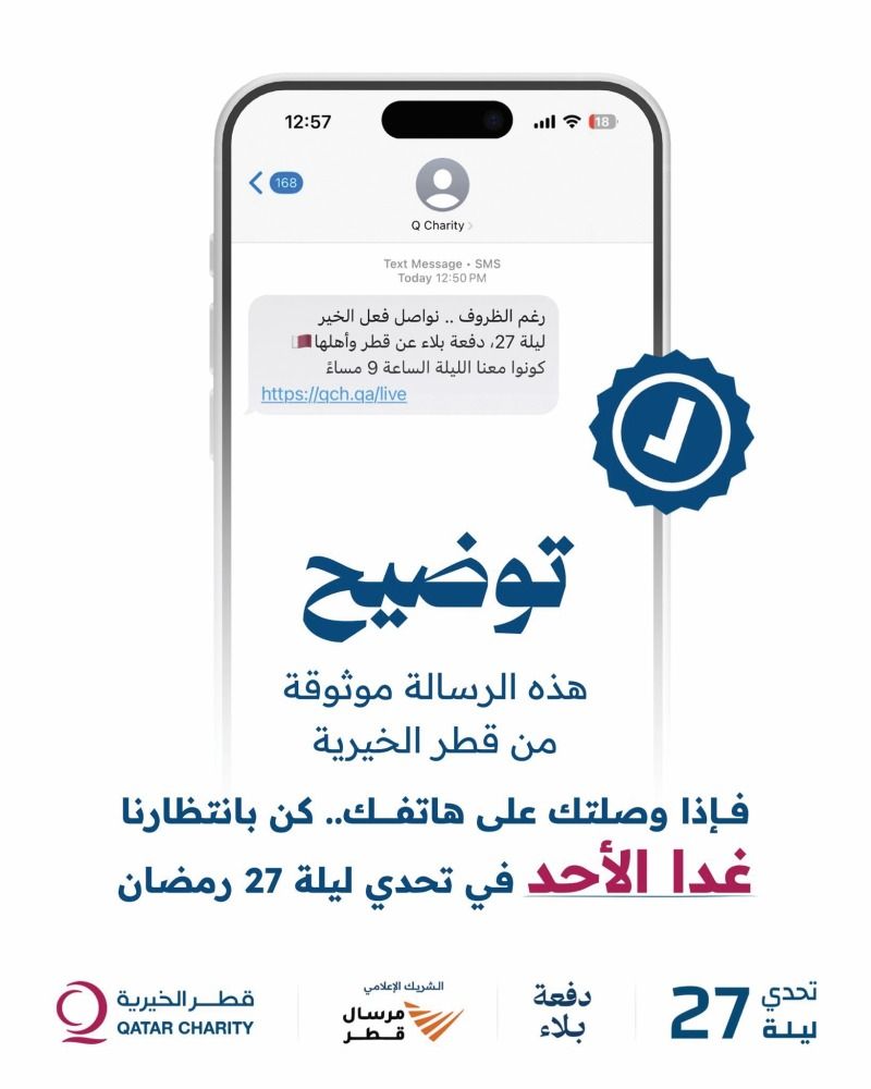 أوضحت قطر الخيرية أن الرسالة التي وصلت إلى هواتف عدد من سكان قطر، والتي جاء فيها: «رغم الظروف.. نواصل فعل الخير ليلة 27 دفعة بلاء عن قطر وأهلها. كونوا معنا الليلة الساعة 9 مساءً https://qch.qa/live»، هي رسالة موثوقة وصادرة عنها.