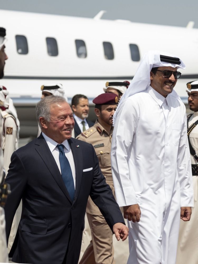 تقدم حضرة صاحب السمو الشيخ تميم بن حمد آل ثاني أمير البلاد المفدى مستقبلي أخيه جلالة الملك عبدالله الثاني ابن الحسين ملك المملكة الأردنية الهاشمية الشقيقة، لدى وصوله والوفد المرافق صباح اليوم إلى مطار الدوحة الدولي، في زيارة عمل للبلاد.