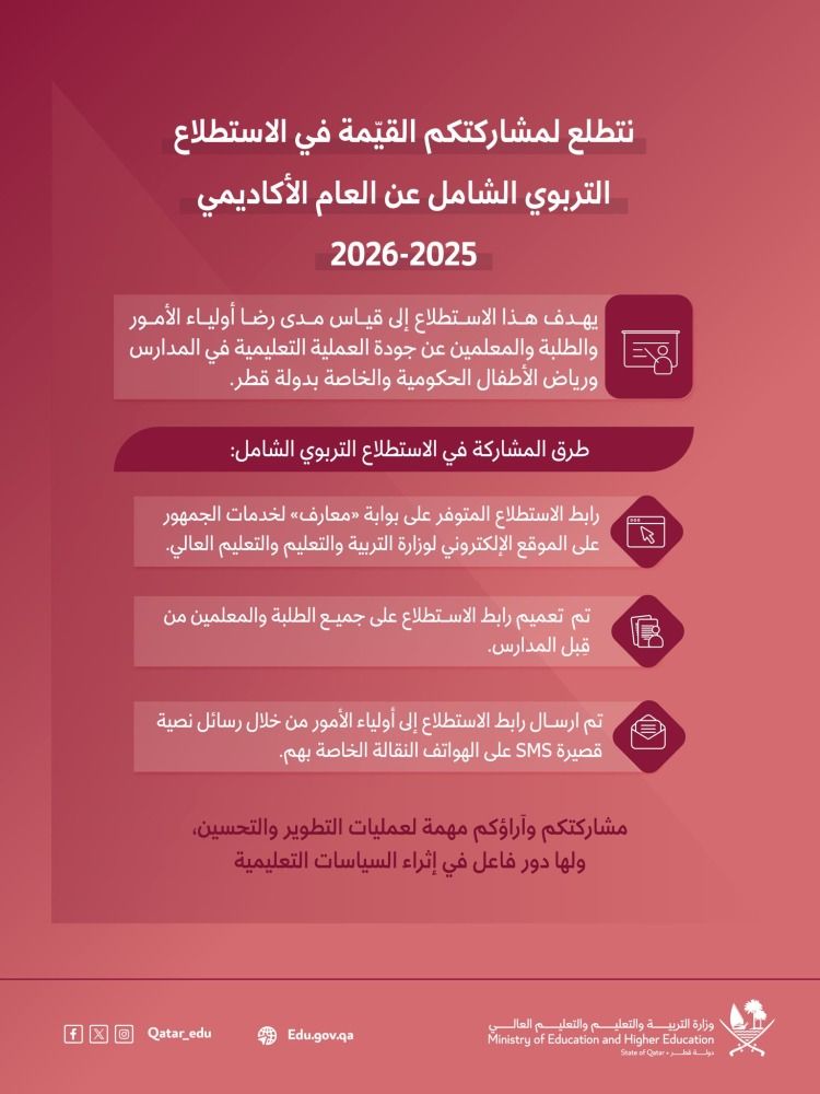 دعت وزارة التربية والتعليم والتعليم العالي، اليوم الثلاثاء، أولياء الأمور والطلبة والمعلمين إلى المشاركة في الاستطلاع التربوي الشامل للعام الأكاديمي 2025–2026.