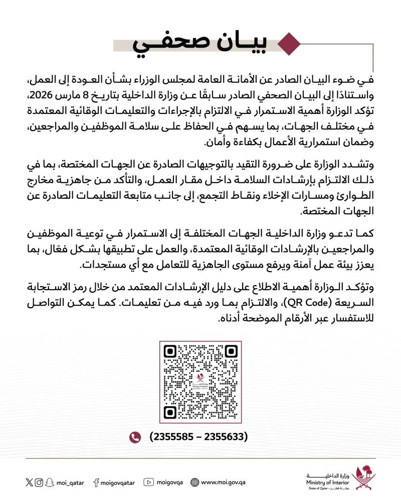 أعلنت وزارة الداخلية أنه في ضوء البيان الصادر عن الأمانة العامة لمجلس الوزراء بشأن العودة إلى العمل، واستنادًا إلى البيان الصحفي الصادر سابقًا عن وزارة الداخلية بتاريخ 8 مارس 2026 تؤكد الوزارة أهمية الاستمرار في الالتزام بالإجراءات والتعليمات الوقائية المعتمدة في مختلف الجهات، بما يسهم في الحفاظ على سلامة الموظفين والمراجعين وضمان استمرارية الأعمال بكفاءة وأمان.