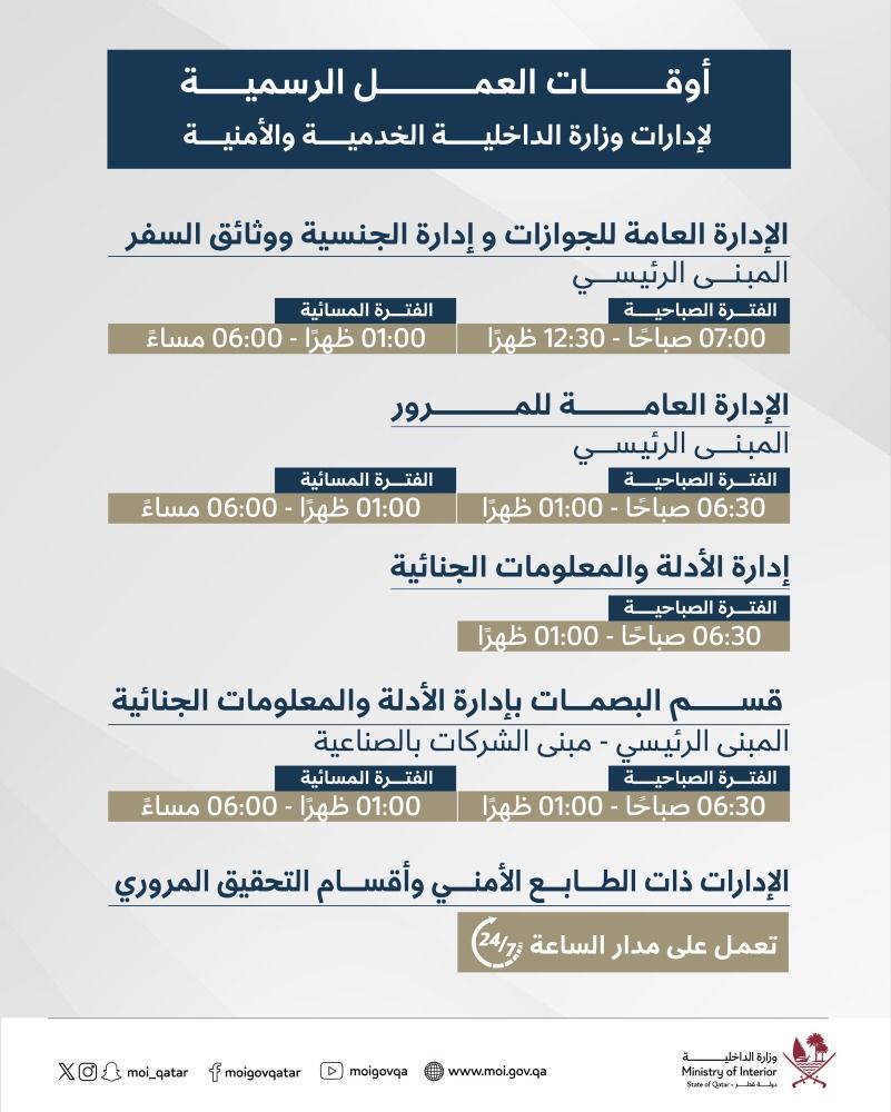 أعلنت وزارة الداخلية عن أوقات العمل الرسمية لإدارات وزارة الداخلية الخدمية والأمنية.