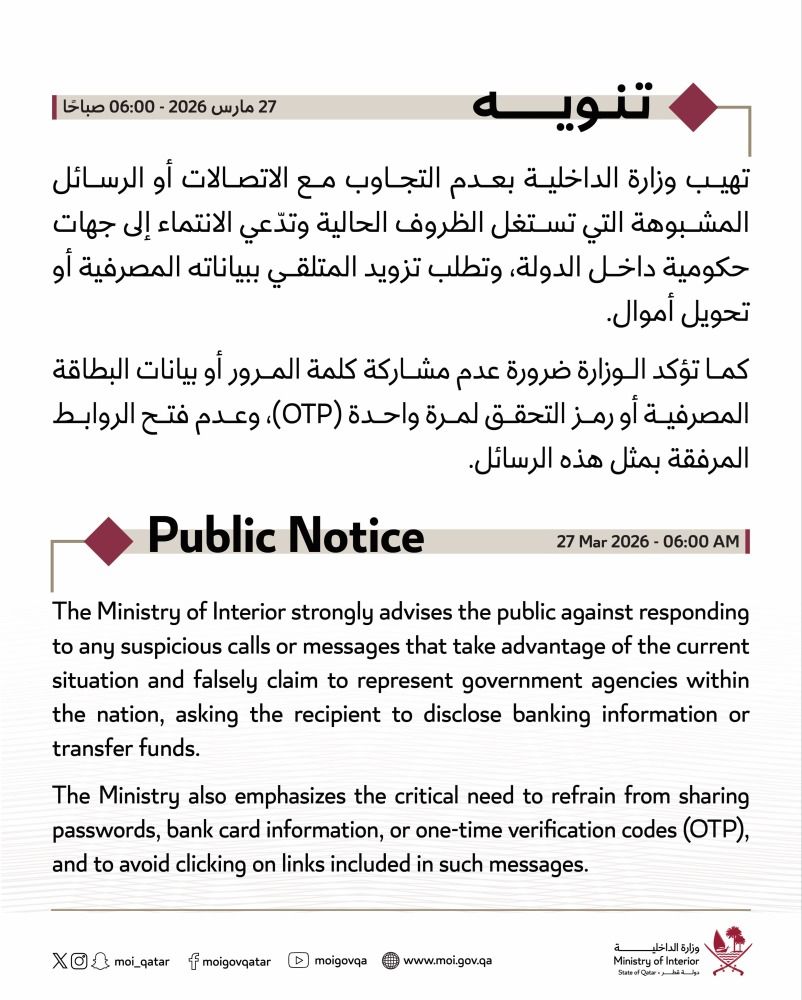 وأكدت وزارة الداخلية ضرورة عدم مشاركة كلمة المرور أو بيانات البطاقة المصرفية أو رمز التحقق لمرة واحدة (OTP) وعدم فتح الروابط المرفقة بمثل هذه الرسائل.