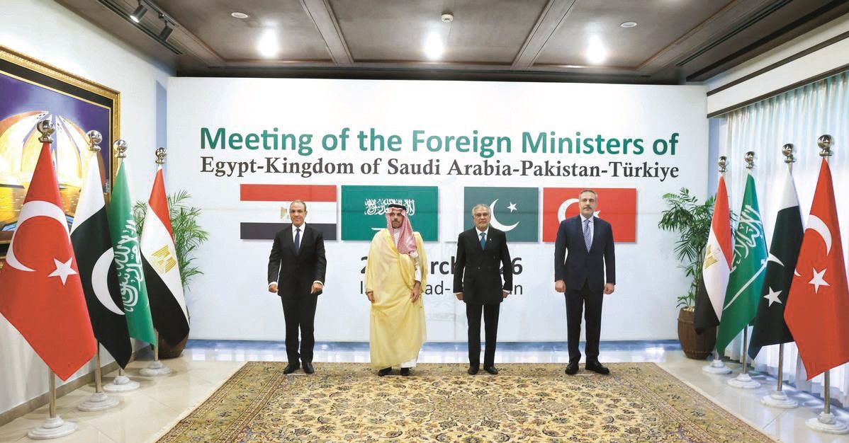 عقد في العاصمة الباكستانية إسلام آباد اجتماع رباعي ضم وزراء خارجية باكستان والسعودية ومصر وتركيا، لبحث سبل وقف التصعيد في المنطقة، وذلك ضمن حراك دبلوماسي متسارع يهدف لإنهاء الحرب التي دخلت شهرها الثاني. وأفاد مراسل الجزيرة أن اللقاء الذي جرى في وزارة الخارجية الباكستانية انتهى بعد ساعتين من انعقاده، وسط انخفاض التوقعات بالخروج بمبادرة لإنهاء الحرب، واحتمال بالاكتفاء بدعوة إلى خفض التصعيد.