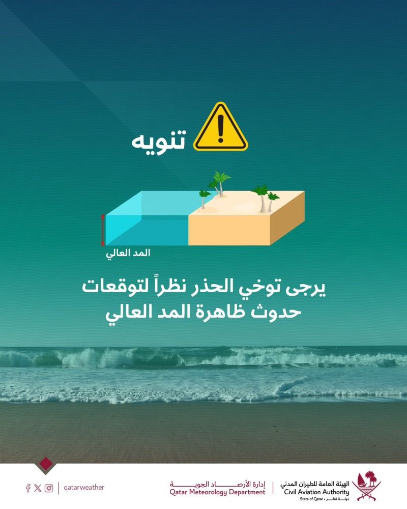وفي تنويه عبر حسابها بمنصة "إكس"، اليوم قالت "أرصاد قطر": يرجى توخي الحذر نظراً لتوقعات حدوث ظاهرة المد العالي، مشيرة في الوقت ذاته إلى استمرار رصد أمطار على بعض المناطق تكون رعدية أحياناً.