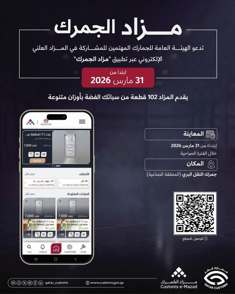 تدعو الهيئة العامة للجمارك المهتمين للمشاركة في المزاد العلني الإلكتروني عبر تطبيق «مزاد الجمرك» الذي بدء اعتبارا من امس.