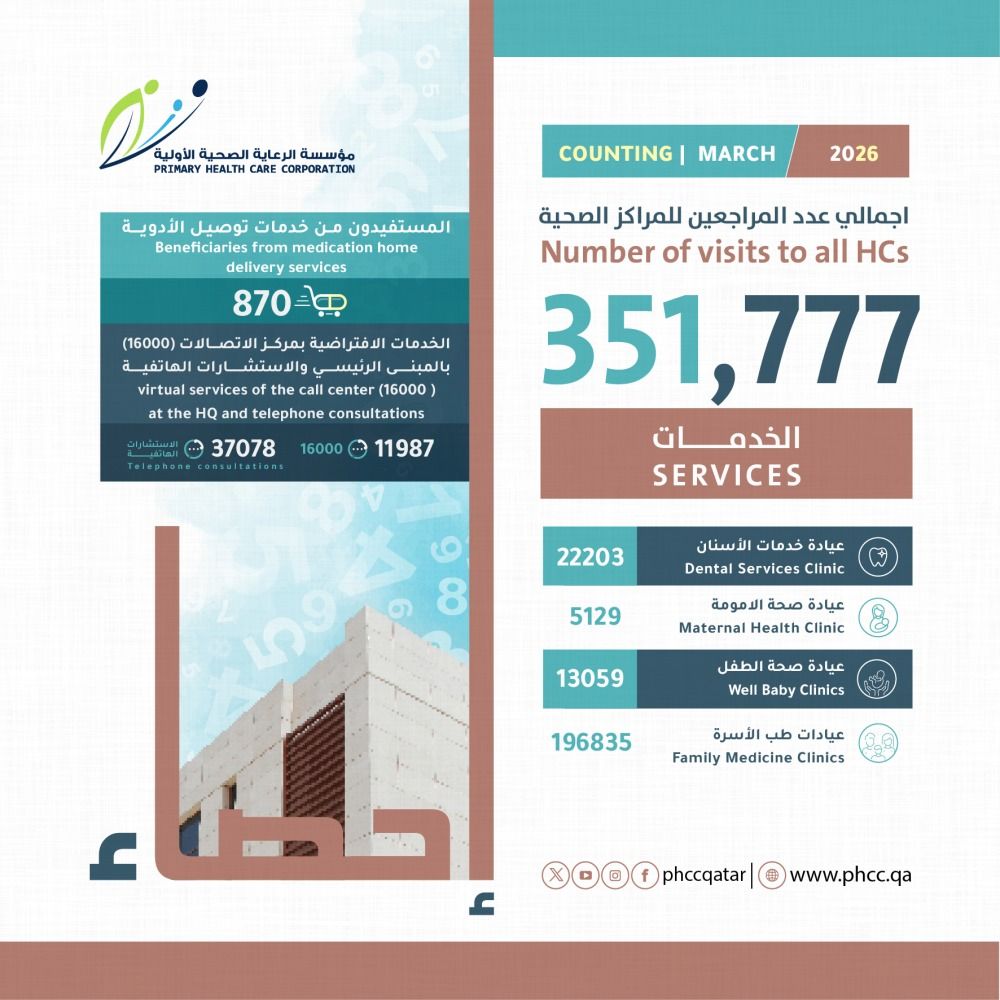 وجاءت إحصائيات شهر مارس 2026 التي نشرتها مؤسسة الرعاية الصحية الأولية عبر حسابها بمنصة "إكس" كالتالي: