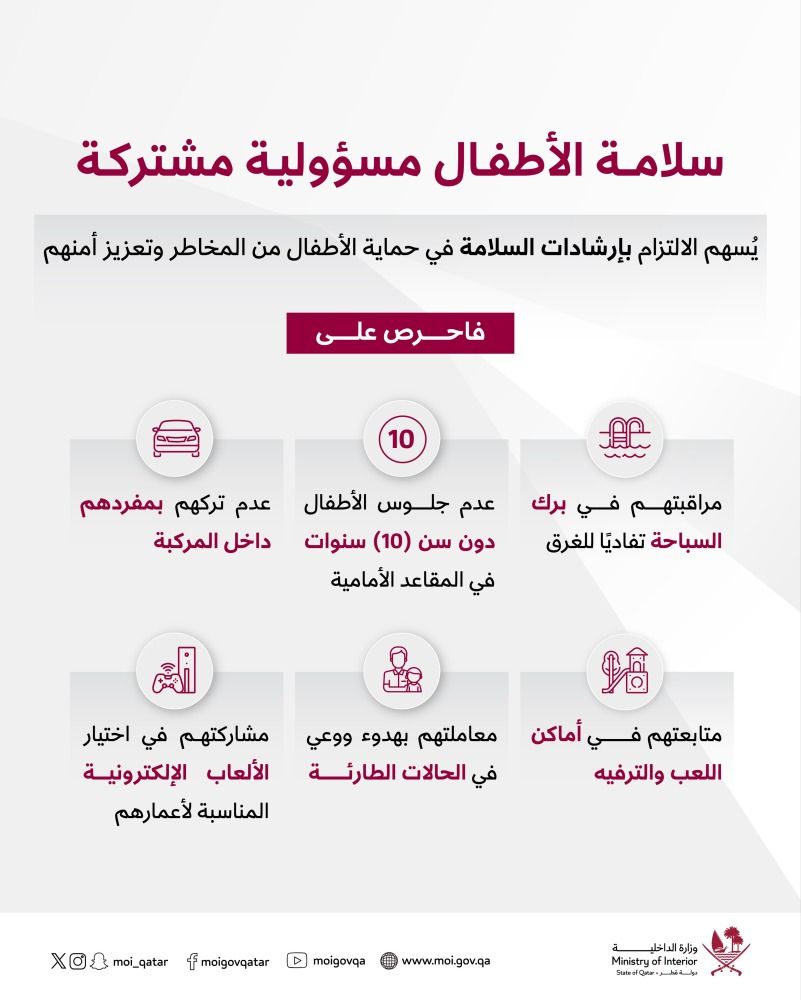 أكدت وزارة الداخلية أن الالتزام بإرشادات سلامة الأطفال يسهم في حمايتهم وتعزيز أمنهم، مشددة على أن سلامتهم مسؤولية مشتركة.