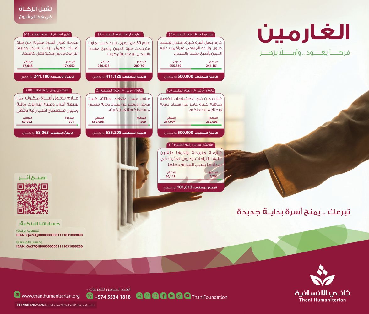 دعت مؤسسة ثاني بن عبد الله الإنسانية أهل الخير والعطاء في دولة قطر إلى المساهمة في مشروع فكّ كُرَب الغارمين دعمًا للأسر المتعثرة ماليا، وتمكينا لها من تجاوز ظروفها الصعبة واستعادة الاستقرار. وتأتي هذه الدعوة في ضوء ما تحقق من تقدّم ملموس خلال الفترة الماضية، بعد تفاعل واسع مع الحالات المطروحة أسهم في سداد ديون عدد من الغارمين بنِسَب متفاوتة، وهو ما مهّد لإضافة حالات جديدة وتوسيع نطاق الدعم الإنساني عبر منصات المؤسسة.